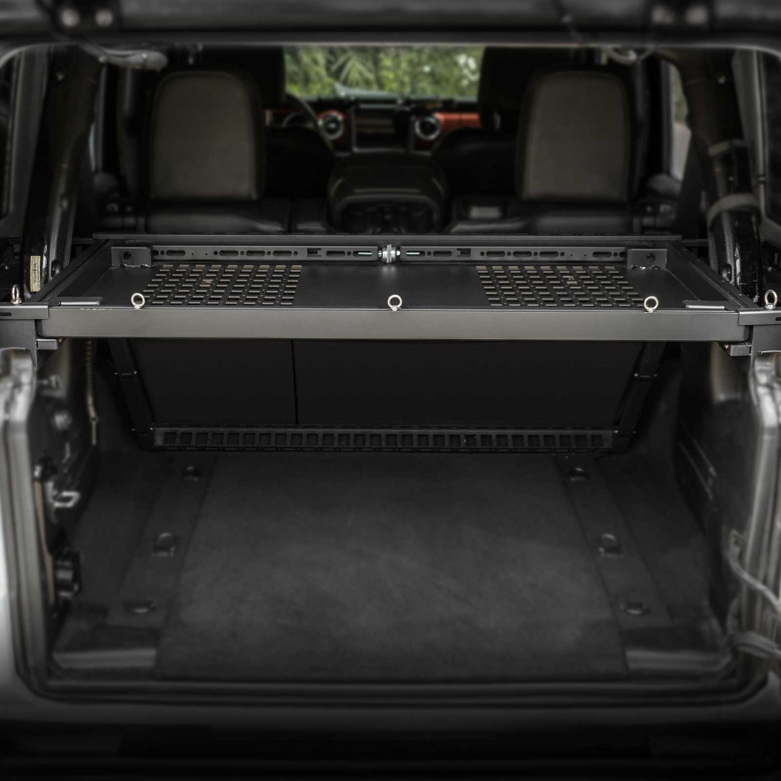 Flexible Storage System: Easily switches storage space with a simple push and pull; features a sliding mechanism that opens or closes the cargo rack along tracks to adjust the trunk's layout for various item sizes
